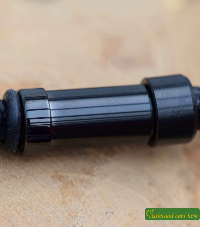 De crematie-as bedel ligt tussen 2 zwart metallic rvs design bedels. De armband is afgewerkt met een veilige rvs zwarte kop/kom schuifsluting. Alle bedels liggen tussen zwart rubberen stoppers vast op de armband. De armband wordt voor u op maat gemaakt, u kan hierbij kiezen of u de armband enkel of dubbel gedragen wenst. Hier zit geen prijsverschil tussen.