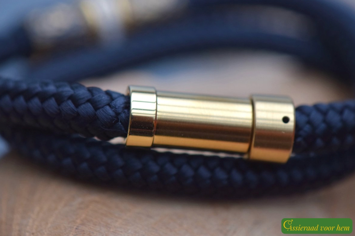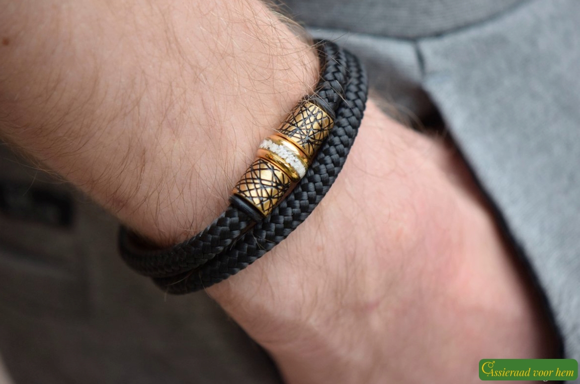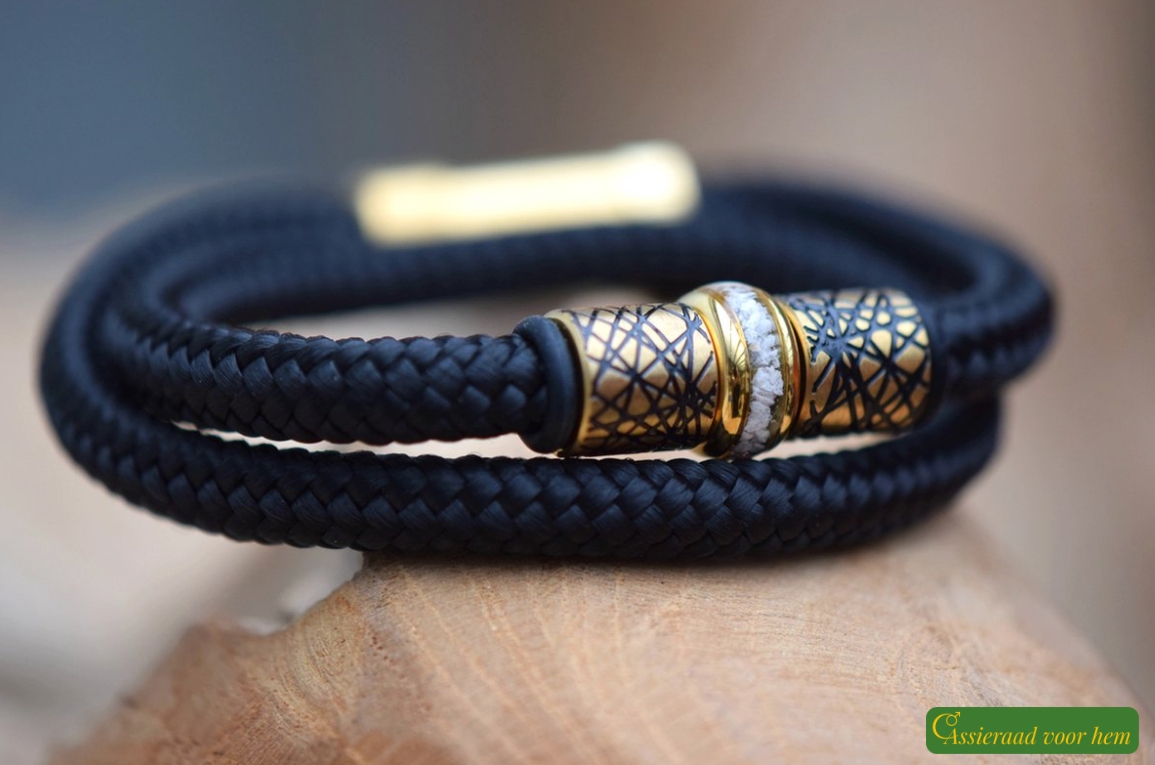 De crematie-as bedel ligt tussen 2 goud/zwart metallic rvs design bedels. De armband is afgewerkt met een veilige rvs gouden kop/kom schuifsluting. Alle bedels liggen tussen zwart rubberen stoppers vast op de armband. De armband wordt voor u op maat gemaakt, u kan hierbij kiezen of u de armband enkel of dubbel gedragen wenst. Hier zit geen prijsverschil tussen. De Sail-Rope armband is een sterke, zwarte 6mm band met een zeer flexibel en aangenaam draagcomfort. Sail Rope is een zeer sterk polyester gevlochten materiaal, soepel in gebruik en heeft een gladde afwerking. Sail Rope wordt door deze sterke eigenschappen ook in de zeilsport gebruikt.