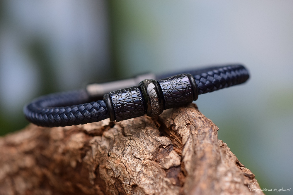 De crematie-as bedel ligt tussen twee blauwe metallic rvs designbedels. Aan weerszijden zorgen twee zwarte rubberen stoppers dat de bedels stevig op hun plaats blijven en niet verschuiven. De armband is afgewerkt met een veilige zwarte rvs kop/kom schuifsluiting. De armband wordt voor u op maat gemaakt; u kunt kiezen of u de armband enkel of dubbel gedragen wilt. Hier zit geen prijsverschil tussen.