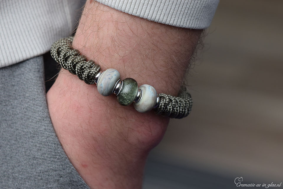 Wenst u liever een andere kleur glasbedel waarbij het crematie-as minder of niet zichtbaar is, dan kunt u dit direct na uw bestelling doorgeven. De crematie-as glasbedel wordt geplaatst tussen twee andere bijpassende glasbedels. De armband is afgewerkt met een rvs zilverkleurige, verlengbare sluiting en wordt speciaal voor u op maat gemaakt.
