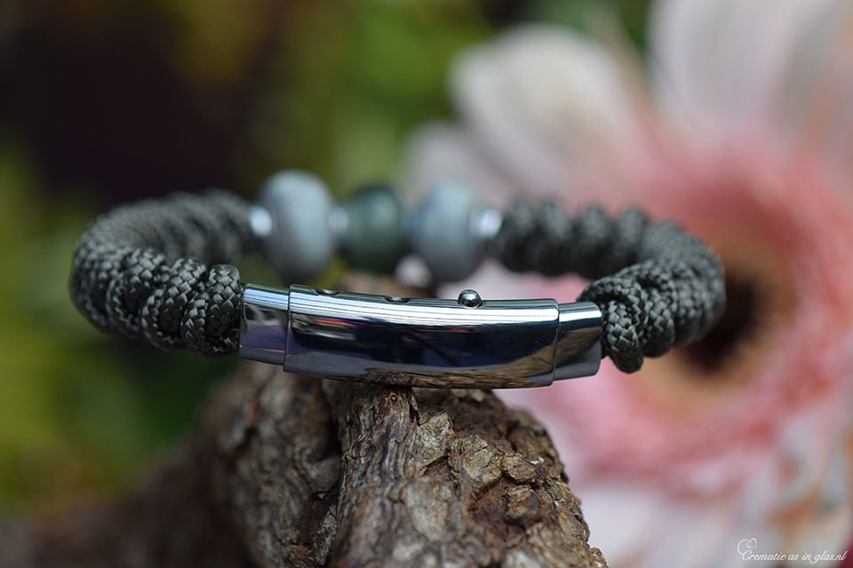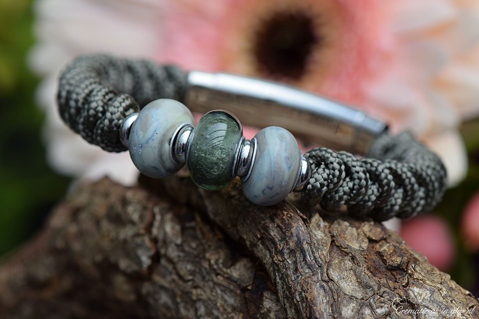 Let op, dit sieraad kunt u thuis niet zelf vullen. Deze armband wordt voor u handgemaakt door Jet, waarbij een kleine hoeveelheid crematie-as ambachtelijk wordt verwerkt in een transparant grijze glasbedel tijdens het glasblazen. In de crematie-as bedel op de foto is het crematie-as zichtbaar verwerkt in het glas.