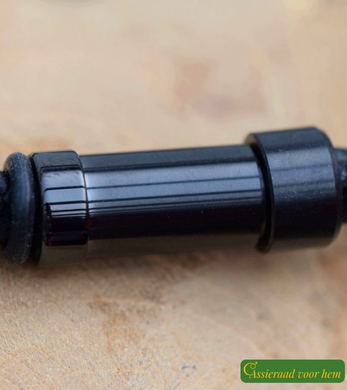 Let op, dit sieraad kan u thuis niet zelf vullen maar wordt voor u handgemaakt door Jet waarbij het crematie-as vast in de middelste rvs bedel verwerkt wordt! In de crematie-as bedel op de foto is het crematie-as zichtbaar in de bedel. Natuurlijk kan u ook voor een andere verwerking/kleur ÃÂn de bedel kiezen als u het crematie-as semi (klein beetje) zichtbaar of liever niet zichtbaar wil hebben. Dit mag u dan direct na uw bestelling doorgeven. De crematie-as bedel ligt tussen 2 zwart/ zilver metallic rvs design bedels in. De armband is afgewerkt met een veilige rvs zwarte kop/kom schuifsluting. Alle bedels liggen tussen zwart rubberen stoppers vast op de armband. De armband wordt voor u op maat gemaakt, u kan hierbij kiezen of u de armband enkel of dubbel gedragen wenst. Hier zit geen prijsverschil tussen. De lederen armband heeft 3 zwarte gladde banden. Getoonde foto’s laten een voorbeeld zien van hoe het herinneringssieraad er uit komt te zien. Houdt er rekening mee dat uw crematie-as bedel niet exact hetzelfde kan worden omdat uw gedenkbedel handwerk is en crematie-as verschillende wit en grijs tinten kan hebben. Nàontvangst van het crematie as wordt uw gedenksieraad én het resterende as bij 8 werkdagen naar u terug gestuurd via pakketpost of brievenbus pakket post van DHL. Mochten er vooraf aan uw bestelling vragen zijn dan beantwoord ik ze graag voor u. Crematie as in glas.nl is een geregistreerd en gewaarborgd merk wat u de garantie geeft voor een uniek en kwalitatief handgemaakt product zonder replica’s of massaproduktie