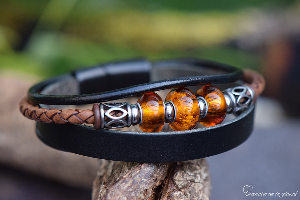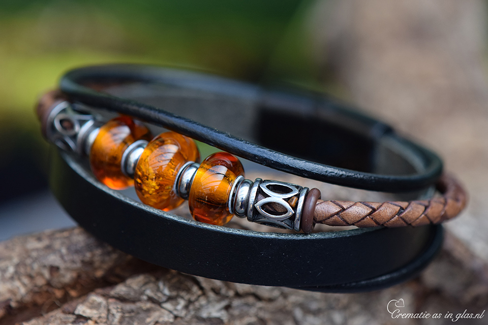 Let op, dit sieraad kan u thuis niet zelf vullen maar wordt voor u handgemaakt door Jet waarbij crematie-as in de middelste transparante bruine glasbedel geblazen/gesmolten wordt! De crematie-as glasbedel ligt tussen 2 andere bruine glasbedels en rvs vintage bedels in. Het crematie-as is zichtbaar in de glasbedel. De armband heeft 3 zwart lederen banden waaronder 1 platte band en 2 gladde banden, en 1 gevlochten bruin lederen band. De armband is afgewerkt met een sterke rvs zwarte magneetsluting. Let wel, dat een magneetsluiting niet blootgesteld mag worden aan overmatig vocht, parfum en transpiratie. Om de sterke geleiding van de magneet te behouden dient u het sieraad af te doen tijdens zwemmen, slapen, douchen en sporten. Getoonde foto’s laten een voorbeeld zien van hoe het herinneringssieraad er uit komt te zien. Houdt er rekening mee dat uw crematie-as glasbedel niet exact hetzelfde kan worden omdat uw gedenkbedel handwerk is. Nàontvangst van het crematie-as wordt uw gedenk sieraad én het resterende crematie-as bij 8 werkdagen naar u terug gestuurd via pakketpost of brievenbus pakket post van DHL. Mochten er vooraf aan uw bestelling vragen zijn dan beantwoord ik ze graag voor u. Crematie as in glas.nl is een geregistreerd en gewaarborgd merk wat u de garantie geeft voor een uniek en kwalitatief handgemaakt product zonder replica’s of massaproduktie