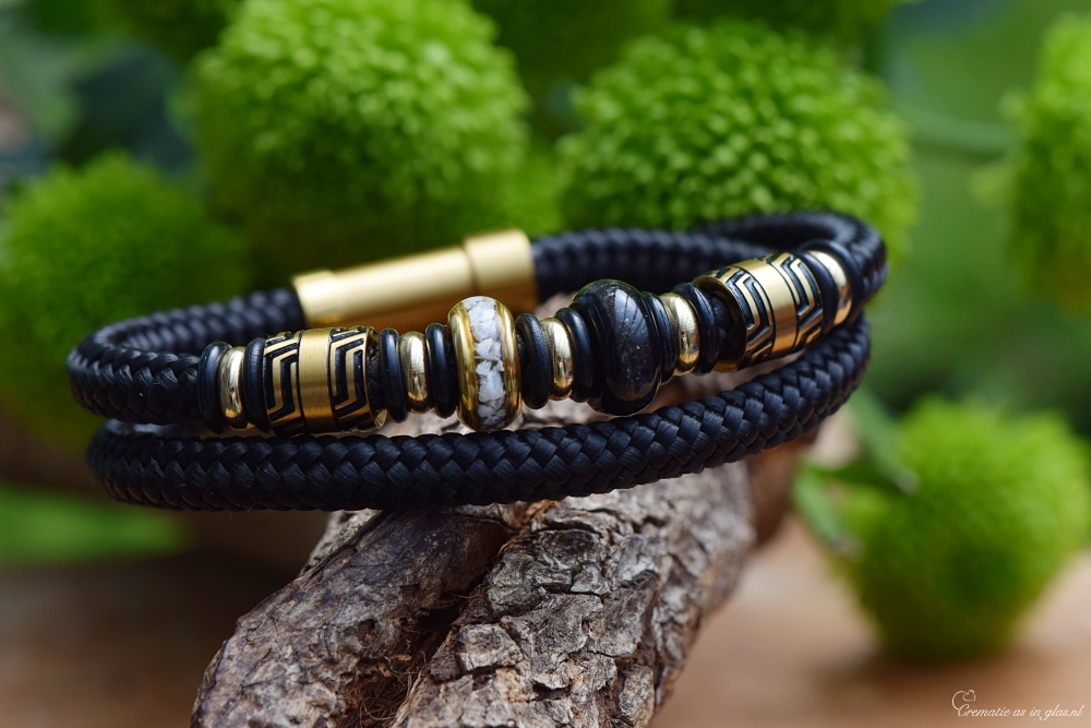 Heren armband van zwarte Sail Rope-band (6 mm), dubbel gedragen en speciaal ontworpen als herinneringssieraad. Deze handgemaakte armband biedt ruimte voor twee herinneringsbedels waarin crematie-as(sen) of haartje(s) verwerkt worden. Per bedel bepaalt u zelf wat erin verwerkt mag worden – beide met crematie-as, beide met haartjes of een combinatie van beide.